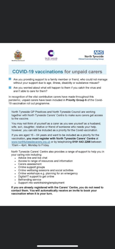Unpaid carers have now been included in Priority Group 6 of the vaccine roll-out but you must register with North Tyneside Carer’s Centre if you are not already.